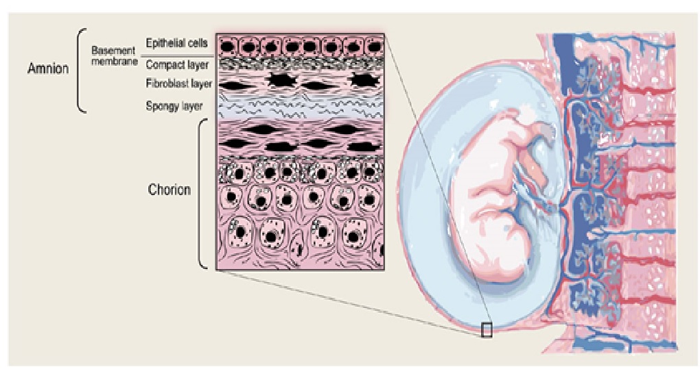 The membranes surrounding the fetus in the uterine cavity are the chorion and amnion. Even though these layers lie close to each other and are very thin, it would be incorrect to understand them as a biologically single layer. The functioning can be accurately understood only by considering them as a bilayer. The chorion is the outer vascular layer that faces the uterine cavity. Inside this lies the amnion, which is an avascular protective layer lining the amniotic fluid.5 The consensus states that the chorion plays a role as an immunological buffer. It stabilizes and prevents the breakdown of the amnion and keeps the fetus is an immune privileged site. The anion is the dominant layer that dictates the mechanical behaviour of the membrane and forms a protective barrier. The amniotic membrane is 0.02-0.05mm thick.1 It is made of a layer of ectodermal columnar cells that are attached to a mesenchymal basement layer with large amounts of collagen.6 On studying the amniotic membrane, it is evident that the ultrastructure has specialized to perform these functions of protection, secretion and intra and trans cellular transport.7