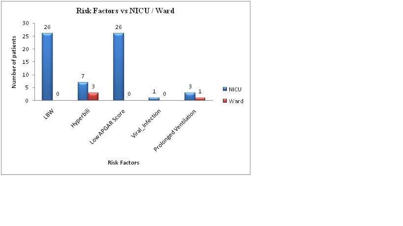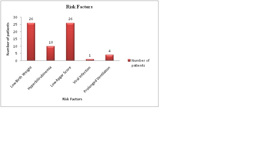 Risk factors included 47.3% newborns with low birth weight, 18% with hyperbilirubinemia , 47.3% with low apgar score,1.8% with viral infections and 7.3% with prolonged ventilation.