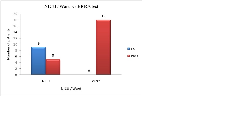 Similar study done by 1 et al Patna, Bihar, India in his study he screened 195 high risk babies,15 neonates came refer on OAE 7.96% 12 neonates 6.15% came positive on BERA having hearing problem. His study implies a 50 fold increase in high risk neonates. In his study low birth weight 48.2%, low apgar score 22.6%,and hyperbilirubinemia 33.3% were the main RISK FACTORS.