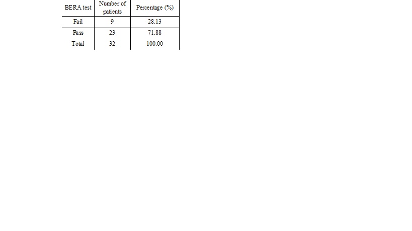 BERA results had 71.8% neonates with pass i.e with normal hearing and 28% fail i.e having hearing disability.