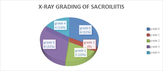 In present study, enthesitis is present in 72% of population among them 36% have Achilles enthesitis, 32% cases of spinal enthesitis and 4 % have Costo-sternal enthesitis. In a comparison study, 88% had evidence of enthesitis. Distribution of sites are as follows - Anterior superior iliac spine 7%, Spinous process of thoracolumbar vertebrae 9%, Heel 33%, Costo-sternal joint 31%, Greater trochanter 12% and Ischial tuberosity 8%5. As the association of HLA-B27 is more in cases of axial involvement, in our study we have screened the patients with axial manifestation and 84% patients have HLA-B27 positivity. In comparison with other study by Taurog JD et al, where HLA-B27 positivity was found in 74 to 89% of patients with either non-radiographic axial spondyloarthritis or Ankylosing spondylitis6. Plain radiograph of sacroiliac joints are graded according to Modified New York classification system. In present study 32% have Grade 0, 20% have Grade 2, 32% have Grade 3 and 16% have Grade 4 diseases. Grade 0 signifies normal joint in plain radiograph so SI joint abnormality in X-ray are seen in 68% of patients in our study group with maximum (32%) patients have Grade 3 sacroiliitis.