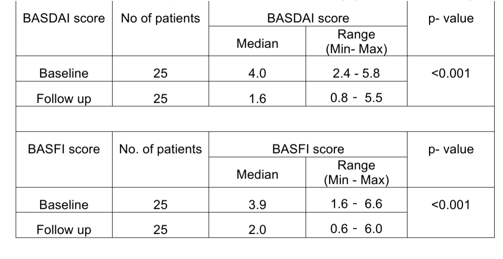 Disease activity in terms of BASDAI and BASFI were calculated. Baseline high disease activity was observed in 7 (28%) with initial BASDAI score more than four.