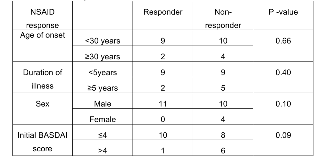 Association of multiple factors with treatment response is noted. NSAIDs response with respect to age of disease onset, duration of illness, gender selection and pre-treatment BASDAI are recorded. No significant association are found with any of these factors. Initial BASDAI less than and equals to 4 group have better NSAIDs response as compared to more than 4 group. As there are 10 NSAIDs responder in lower BASDAI group and only 1 responder in higher BASDAI. Though clinical trend is there but no statistical significance (p=0.09). Other factors like age at onset (p=0.66), duration of illness (0.40) and gender (0.10) doesn’t have significant association with NSAID response.
