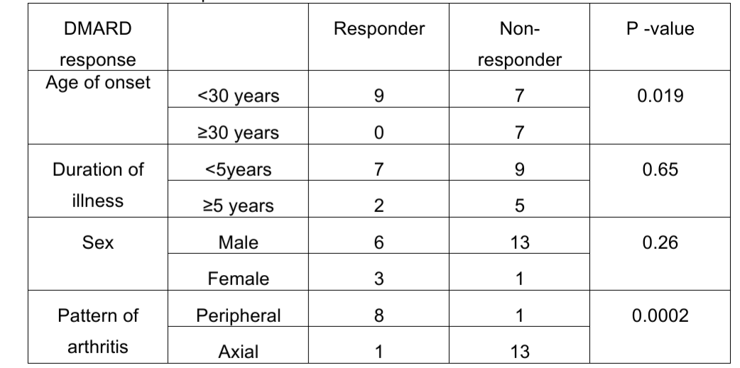 Peripheral arthritis (p= 0.0002) and early onset disease (age <30 years) have favourable outcome with DMARD therapy (p= 0.019) (p <0.05 considered significant).